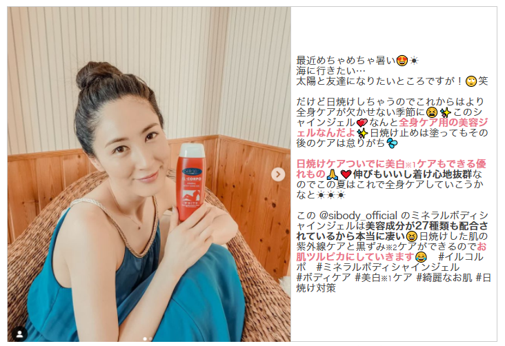 シャインジェルは多くのモデルさんたちの間でも話題になっています。アメリカ在住で女優として活躍中の吉松育美さんもシャインジェルの虜!日差しが痛いと感じるくらいのアメリカでは、乾燥や日焼けが特に問題と言いますが、シャインジェルで毎日しっかりケアしているから、うるうる美肌が保たれているんですね。